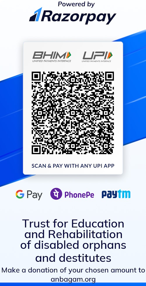 Now again we come back to you for inspiration and support. You are requested to visit Anbagam on any day by giving a call to (+91) 9444009988 / (+91) 8807865616 and personally witness what we have done with your donations in the past.